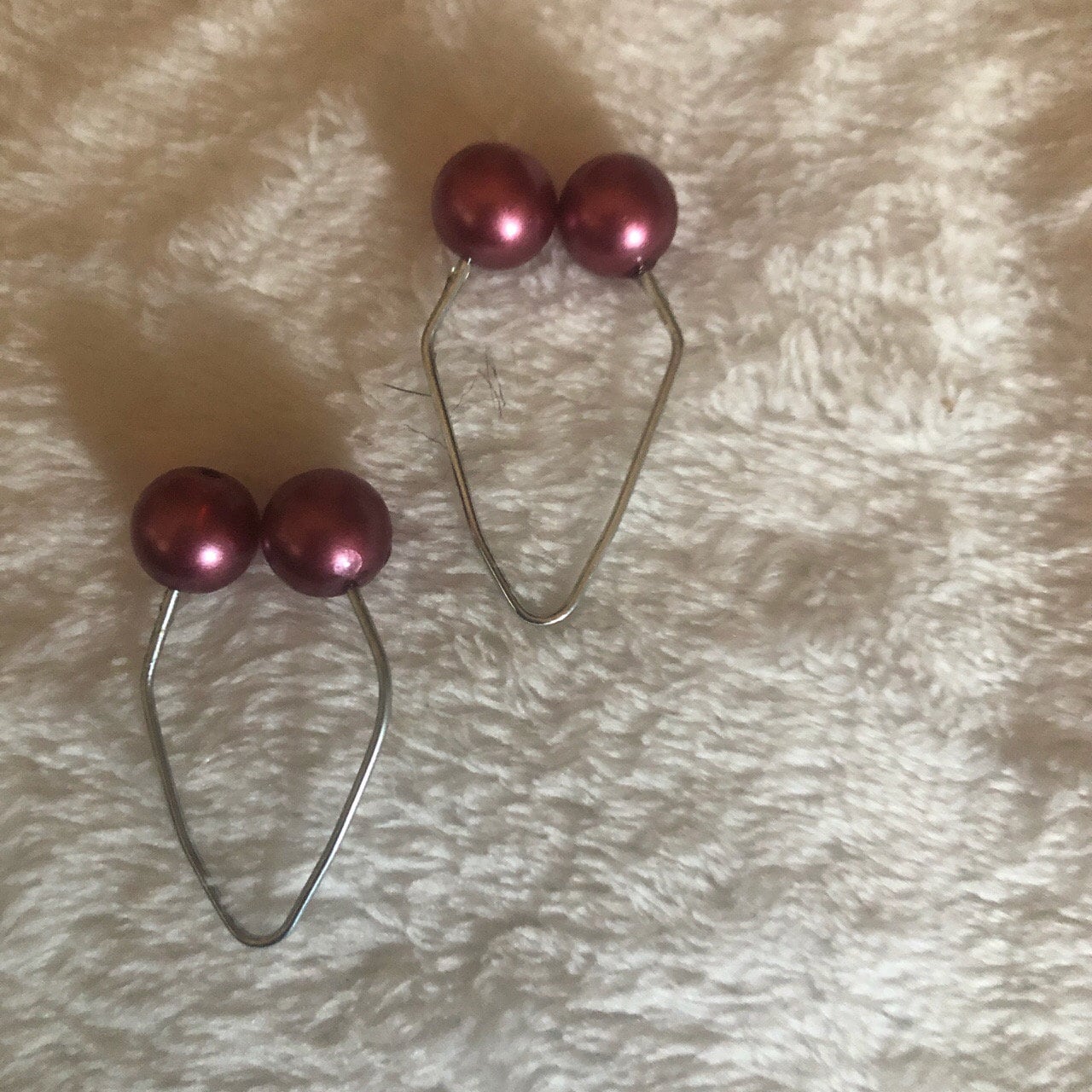 They come in pairs. Each one is a loop of metal with a bead on each end. You slip them around the corners of your mouth. The beads pinch your cheeks from the outside and inside, and create little dents.
